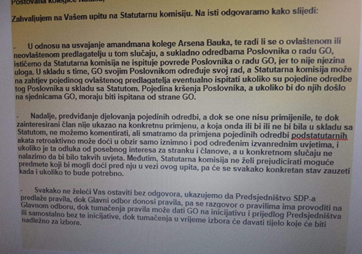 Naime, nakon objašnjenja koji je posao Statutarne komisije i Glavnog odbora, rekao je kako Glavni odbor ne može donositi odluke retroaktivno, osim u iznimnim i rijetkim situacijama. Tako, a kako se vidi iz priložene slike odgovora, vidljivo je kako amandman Arsena Bauka neće proći te će se Ranko Ostojić i drugi ipak moći kandidirati na dužnosti unutar svojih županijskih organizacija, dolazili ili ne na sjednice.