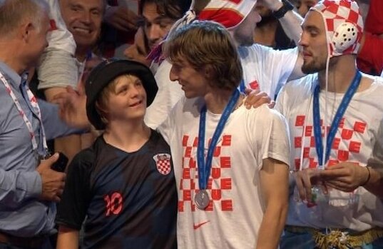 Veznjaku Reala iz Madrida je, tijekom proslave na pozornici na glavnome zagrebačkom trgu, rečeno kako je među okupljenim navijačima i Petar Brcković iz Velike Gorice, dječak s Downovim sindromom čiji je Modrić omiljeni nogometaš, pa bi ga volio pozdraviti.