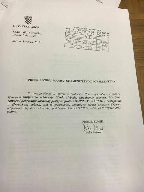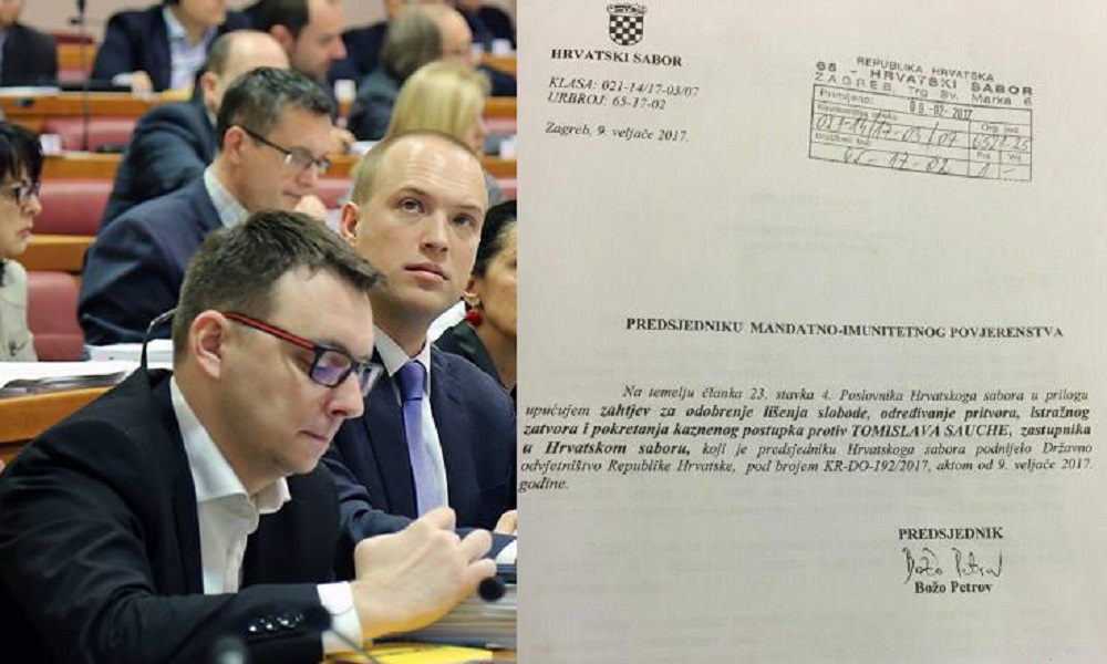 Božo Petrov traži odobrenje lišenja slobode, određivanje pritvora, istražnog zatvora i pokretanje kaznenog postupka protiv Tomislava Sauche, zastupnika SDP-a.