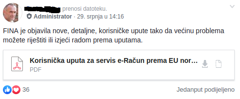 Zanimljivo je da je FINA 29. srpnja objavila nove 'Korisničke upute za servis e-Račun' koje su objavljene i u grupi, ali u Ministarstvu gospodarstva već gotovo četiri godine navode da 'sustav radi bez poteškoća'.