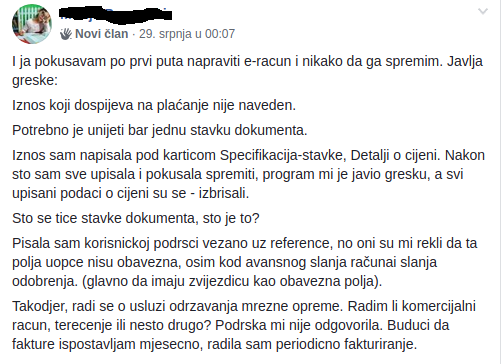 Međutim, informacije portala Direktno ukazuju da nije baš tako. Djelatnici tvrtki koje posluju preko javne nabave čak su osnovali Facebook grupu 'Korisnici servisa FINA e-Račun' kako bi podijelili iskustva i pomogli jedni drugima u korištenju sustava. Ista grupa prepuna je prigovora, tehničkih nedoumica i kritika na zbunjujući sustav.