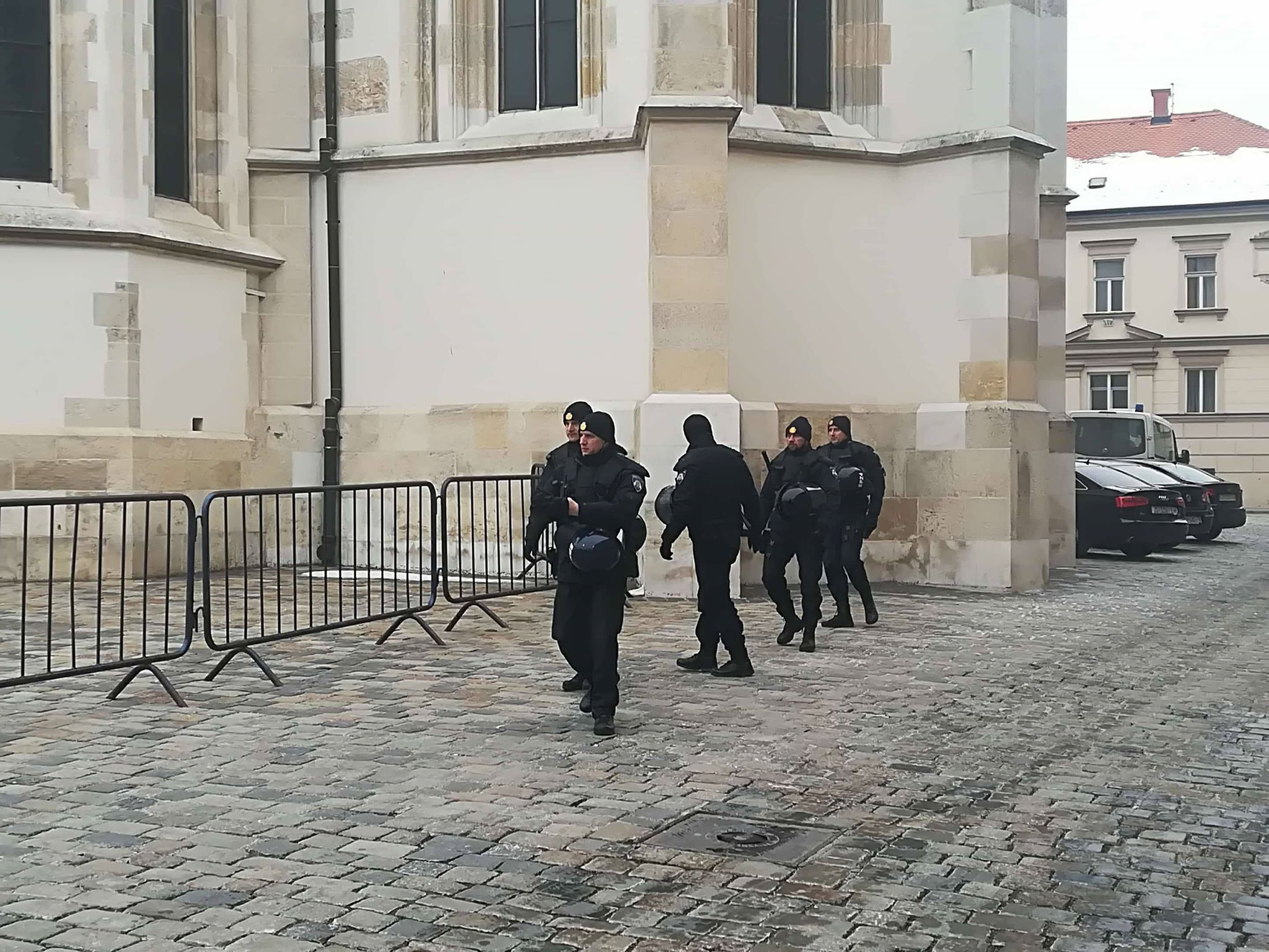 Prosvjednici šeću s transparentima unutar policijske blokade na Trgu sv. Marka, ispred Hrvatskog sabora i Vlade.