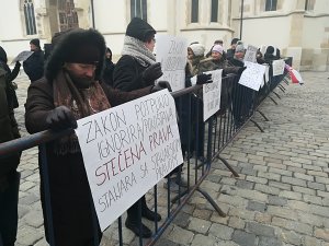 Stotinjak članova HSUS-a ispred Hrvatskog sabora prosvjeduju zviždeći i radeći buku te noseći transparente na kojima piše da se 'nepravde ne mogu ispraviti novim nepravdama' i da je riječ 'o prevari'. Ističu kako tim prosvjedom žele utjecati na saborske zastupnike da odbace ovakav prijedlog izmjene Zakona koji je danas u prvom čitanju u Hrvatskom saboru.