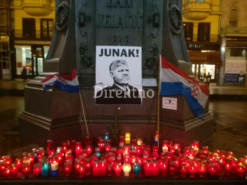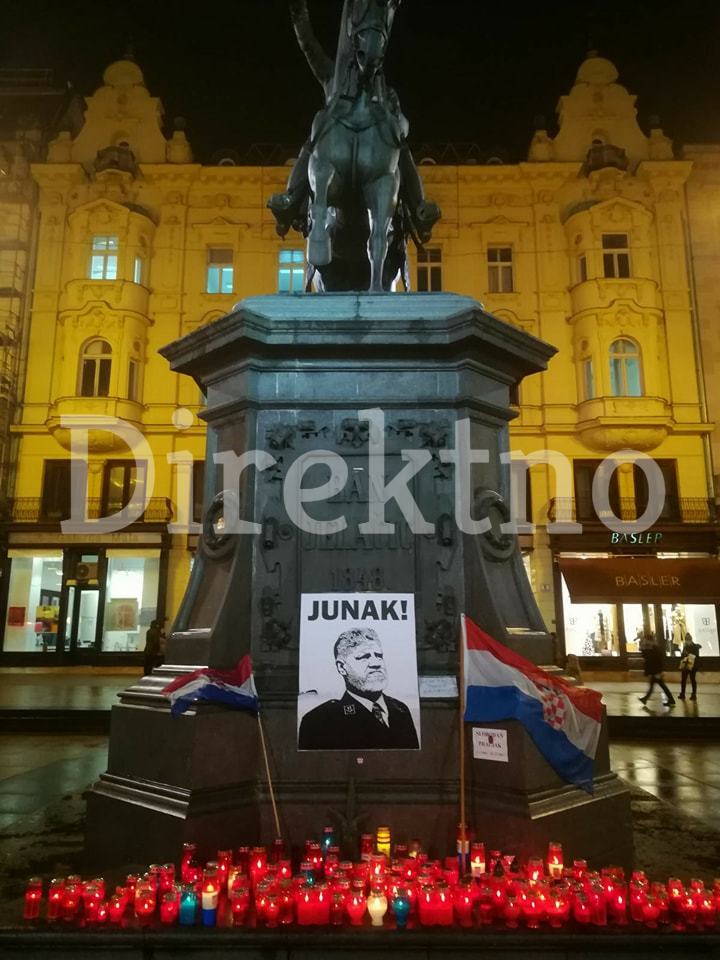 Naime, na Trgu bana Jelačića u Zagrebu, ispred spomenika zapaljene su svijeće, a stavljena je i slika generala Praljka uz dvije hrvatske zastave.