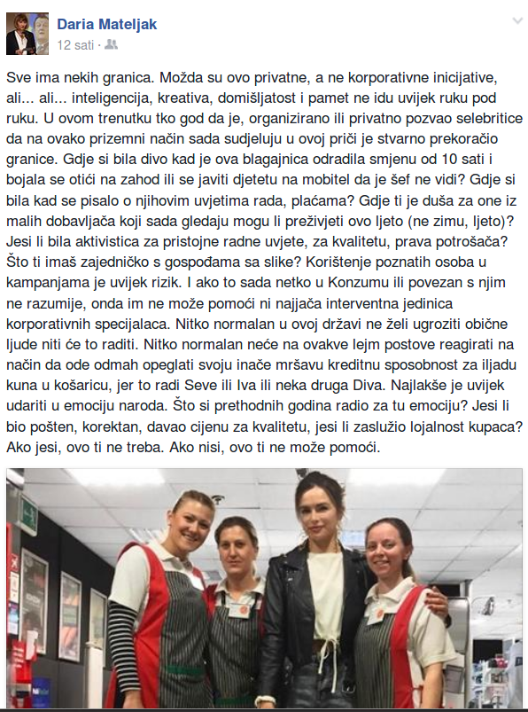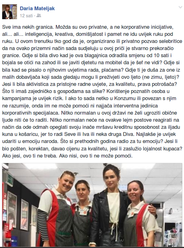 "U ovom trenutku tko god da je, organizirano ili privatno, pozvao 'selebritice' da na ovako prizemni način sada sudjeluju u ovoj priči je stvarno prekoračio granice. Gdje si bila, divo, kad je ova blagajnica odradila smjenu od deset sati i bojala se otići na zahod ili se javiti djetetu na mobitel da je šef ne vidi? Gdje si bila kad se pisalo o njihovim uvjetima rada, plaćama? Gdje ti je duša za one iz malih dobavljača koji sada gledaju mogu li preživjeti ovo ljeto (ne zimu, ljeto)? Jesi li bila aktivistica za pristojne radne uvjete, za kvalitetu, prava potrošača? Što ti imaš zajedničko s gospođama sa slike? Korištenje poznatih osoba u kampanjama je uvijek rizik. I ako to sada netko u Konzumu ili povezan s njim ne razumije, onda im ne može pomoći ni najjača interventna jedinica korporativnih specijalaca. Nitko normalan u ovoj državi ne želi ugroziti obične ljude, niti će to raditi. Nitko normalan neće na ovakve 'lejm' postove reagirati na način da ode odmah 'opeglati' svoju inače mršavu kreditnu sposobnost za 'iljadu kuna u košaricu, jer to radi Seve ili Iva ili neka druga Diva. Najlakše je uvijek udariti u emociju naroda. Što si prethodnih godina radio za tu emociju? Jesi li bio pošten, korektan, davao cijenu za kvalitetu, jesi li zaslužio lojalnost kupaca? Ako jesi, ovo ti ne treba. Ako nisi, ovo ti ne može pomoći''.