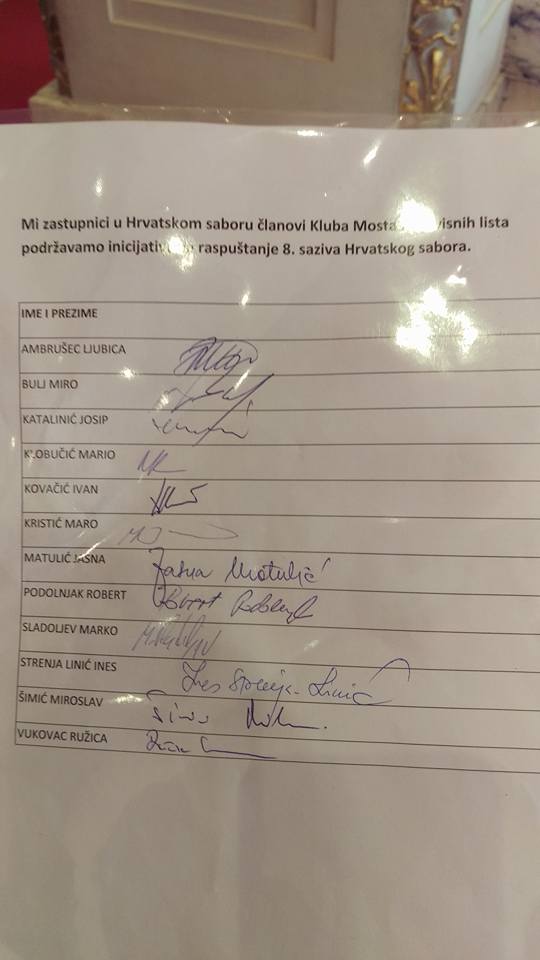 Most nezavisnih lista pred sjednicu Sabora predočio je listu potpisa svih svojih 12 zastupnika za raspuštanje Sabora, na koje su spremni u slučaju opoziva premijera Tihomira Oreškovića.