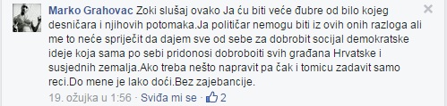 U Facebook grupi naziva Podrška Zoranu Milanoviću - premijeru RH osoba pod imenom Marko Grahovac napisala je nekoliko komentara prijetećeg sadržaja. Među ostalim, Grahovac piše: