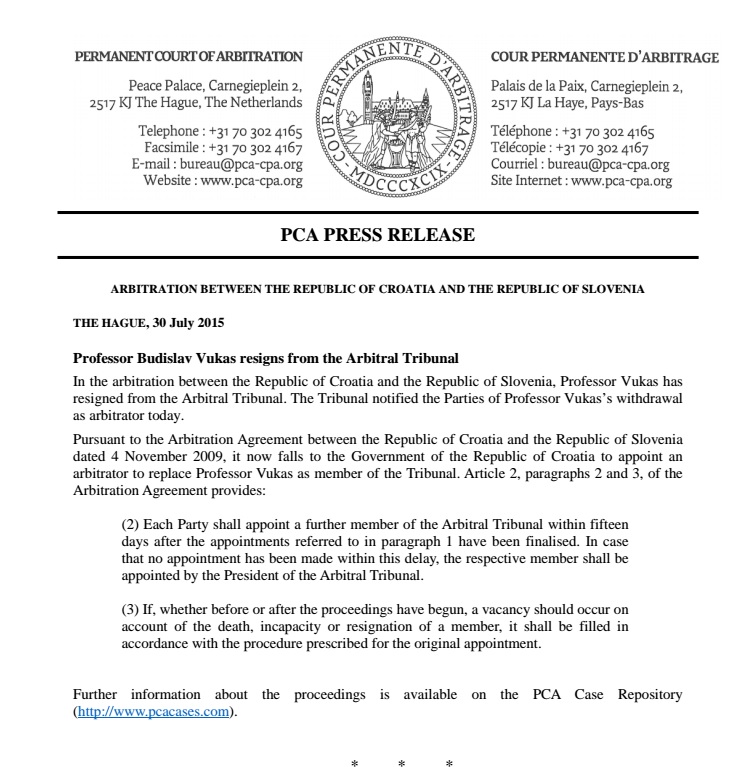 Sud je u priopćenju istaknuo da je obavijestio strane u arbitraži, Republiku Sloveniju i Republiku Hrvatsku, o povlačenju profesora Vukasa kao arbitra.