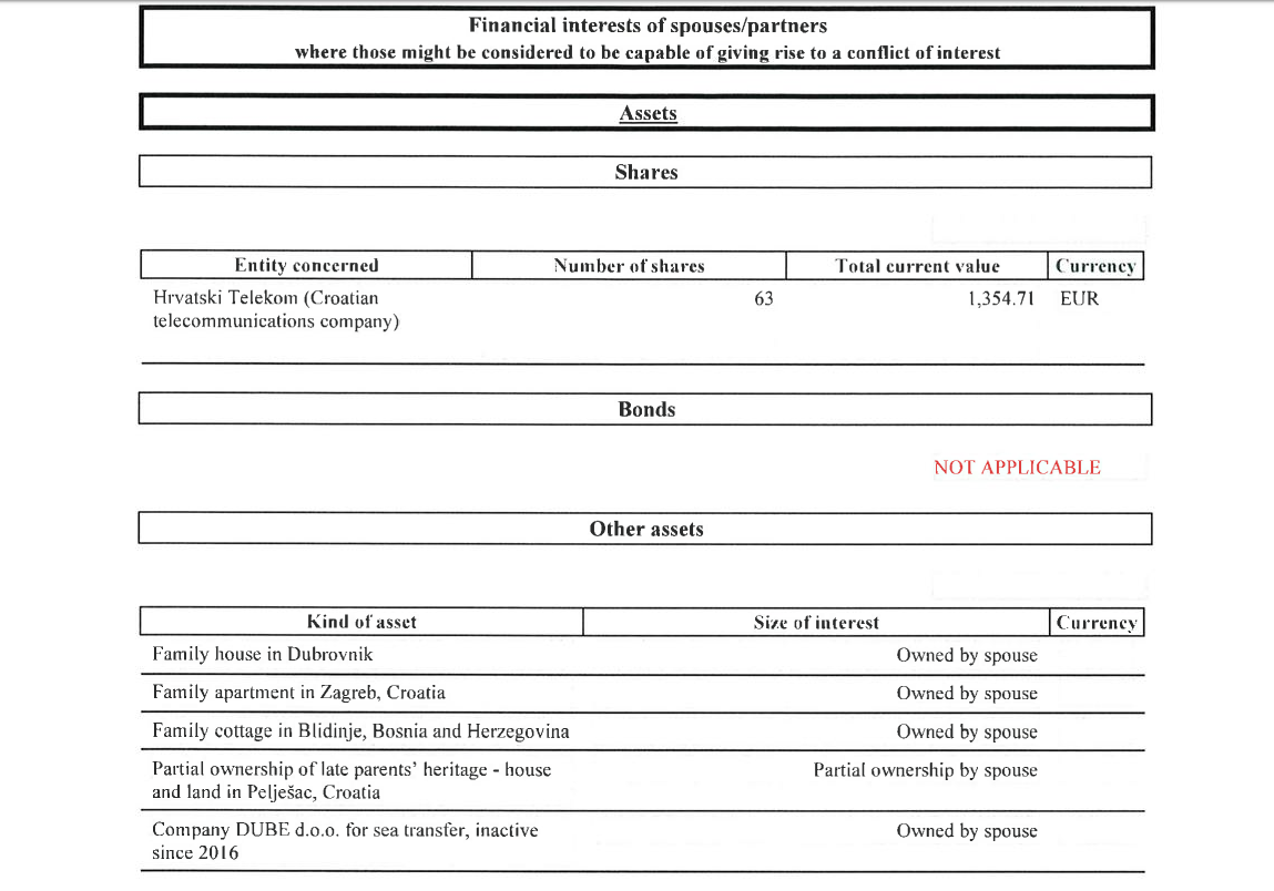 S druge strane, kandidatkinja za mjesto potpredsjednice Europske komisije navedena je kao vlasnica 69 dionica tvrtke Atlantska plovidba procijenjene vrijednosti 4105 eura te, kao i suprug, još 63 dionice Hrvatskog telekoma.