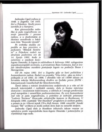 "Drugi dan vidjela sam one koji su zatočeni puno prije mene. Njihova lica bila su nedefinirana masa, smrdili su na krv i fekalije, na rukama i nogama bili su otvoreni prijelomi, ne, to nisu deveta vrata pakla, to je dno dna. Već istu noć prvi put sam silovana. Utroba mi se u nemoćnom otporu mišića kidala. U trenutku mi se činilo da gubim razum. Noću slušate korake, krikove, osluškujete i po boji glasa pokušavate raspoznati tko bi to mogao biti. Pitate se jeste li vi sljedeća. Silovanja su bila dio ukupne kazne. Imala sam krizu deseti dan, isplakala sam cijeli svoj život i razmišljala kako da se ubijem. No dan poslije, u silnom strahu za mog sina, nešto se u meni prelomilo. Naučite kontrolirati svaki pokret i uhvatite ritam logora. Svima nama dugo je trebalo da naučimo živjeti izvan njegovih zidina, čak smo se, godinama poslije, znale uloviti da šapućemo."