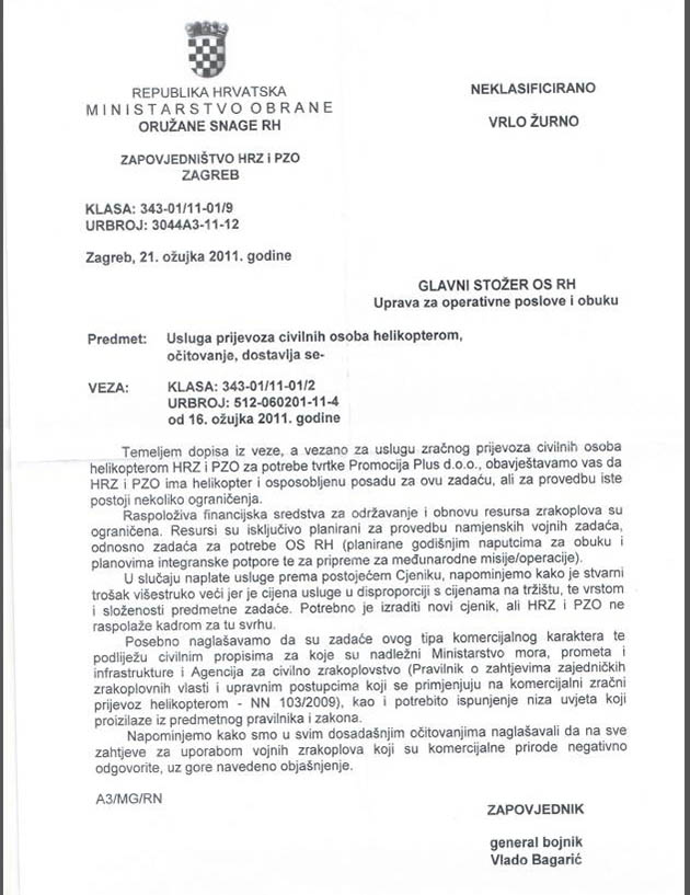 „Temeljem dopisa vezano za uslugu zračnog prijevoza civilnih osoba helikopterom HRZ i PZO za potrebe tvrtke Promocija Plus d.o.o., obavještavamo vas da HRZ i PZO ima helikopter i osposobljenu posadu za ovu zadaću, ali za provedbu iste postoji nekoliko ograničenja. Raspoloživa financijska sredstva za održavanje i obnovu resursa zrakoplova su ograničena. Resursi su isključivo planirani za provedbu namjenskih vojnih zadaća, odnosno zadaća za potrebe OS RH ( planirane godišnjim naputcima za obuku i planovima integranske potpore te za pripreme za međunarodne misije/operacije).