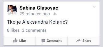 Iz SDP-a je odmah uslijedio protuudar; na svom FB-u oglasila se izvjesna Sabina Glasovac, s ironičnim komentarom- pitanjem: Tko je Aleksandra Kolarić? U želji da bude duhovita, ispala je smiješna, a bez ikakve želje za obranom Kolarićke, koja to sama jako dobro radi, jer je poznata po svojoj rječitosti, a tko je je Sabina Glasovac?