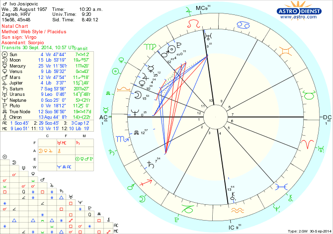 Dosadašnji predsjednik RH u prvom mandatu Ivo Josipović rođen je 28. kolovoza 1957. godine u 10.20 sati ujutro, dakako, u glavnom gradu Republike Hrvatske, Zagrebu. Predsjednički kandidat Josipović rođen je u astrološkom znaku Djevica s podznakom (Ascedentom) u Škorpionu i Noćnim Svjetlom Mjesecom u Vagi. Tranzit svemoćnog Jupitera u Josipovićevom 10. polju horoskopa u vrijeme održavanja ovogodišnjih predsjedničkih izbora u Republici Hrvatskoj i Jupiterovo nedostatno približavanje Josipovićevom natalnom Dnevnom Svjetlu Suncu donosi mu mnoge povoljnosti, no, istovremeno približavanje tranzitnog Jupitera "Bogu pakla i mistike", opasnom Plutonu, moglo bi u predsjedničkoj kampanji "izbaciti" poprilično novog prljavog rublja na račun samog Ive Josipovića, što se svakako neće na njega dobro odraziti. Josipovićeva nedavna smjena savjetnika Dejana Jovića nije polučila gotovo nikakav efekt u javnosti, nego je samo imala ulogu "mazanja očiju" hrvatskog biračkog tijela, a to glasači itekako vide i uočavaju. Već spomenuti tranzit svemoćnog Jupitera u Josipovićevom 10. polju horoskopa i njegovo približavanje natalnom Suncu donosi mu šanse, no, donosi mu također i opasan odnos s tranzitnim Saturnom u znaku Škorpion, a što je Josipovićev podznak. Nije isključeno Josipovićevo "ratovanje" s vlastitim egom, što po njega na ovim izborima može biti izrazito pogubno, te dodatno ojačati Josipovićevu disharmoničnost spram odnosa s biračkim tijelom i političkim protivnicima u vrijeme predsjedničke kampanje.