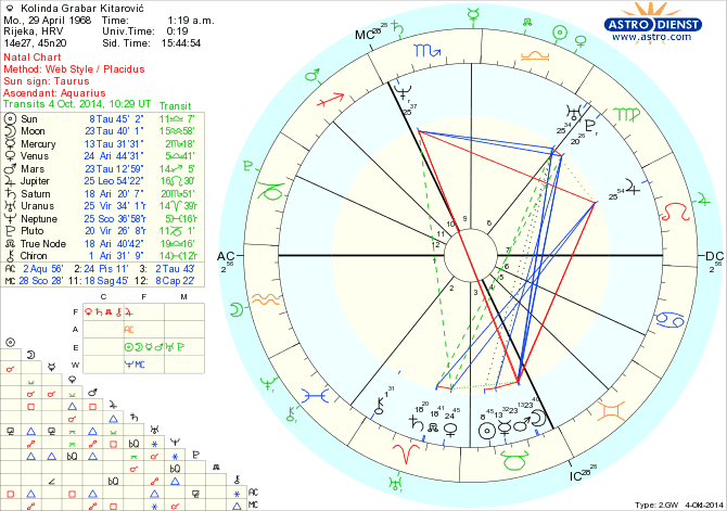Predsjednička kandidatkinja, hrvatska diplomatkinja i pomoćnica Glavnog tajnika Saveza NATO za javnu diplomaciju gospođa Kolinda Grabar Kitarović rođena je 29. travnja 1968. godine u 1.19 sati poslije ponoći, dakako, u Rijeci, Republika Hrvatska, jasno, u Astrološkom znaku Bik s Ascedentom (podznakom) u Vodenjaku i Mjesecom u Biku.