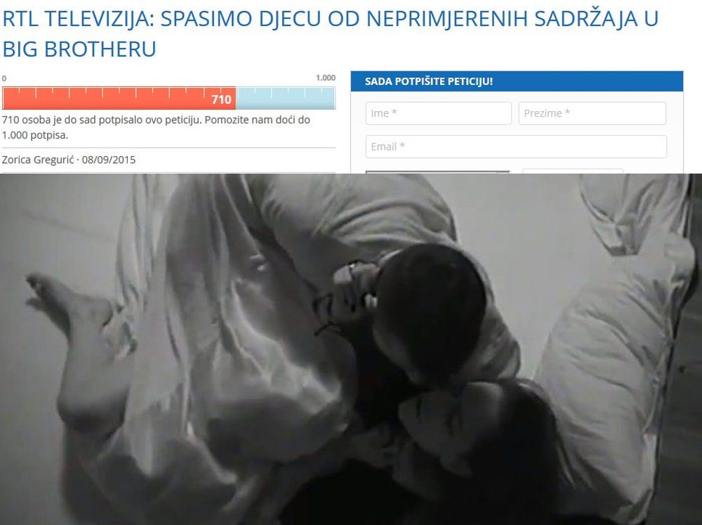Tako je Zorica Gregurić na stranici citizengo.org pokrenula peticiju ''RTL televizija: Spasimo djecu od neprimjerenih sadržaja na Big Brotheru' , kako je ispričala za portal Direktno.hr, nakon brojnih poziva i pritužbi zabrinutih roditelja. Da su državne nadležne institucije reagirale na ovakve sadržaje od početka, potrebe za peticijom ne bi bilo. Ovako, Gregurić i potpisnici kojih je do trenutka pisanja ovog teksta 700, zahtijevaju da se emitiranje emisije "Big Brother" pomakne poslije 22 sata te zabrani prikazivanja reprize u vremenu od 07-22 sata.