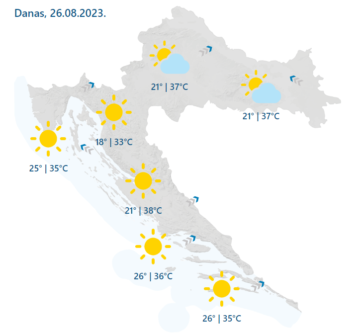 Pretežno sunčano, vruće i vrlo vruće s najvišom dnevnom temperaturom između 33 i 38 Celzijevih stupnjeva, prognoza je Državnog hidrometeorološkog zavoda (DHMZ) za Hrvatsku za subotu.