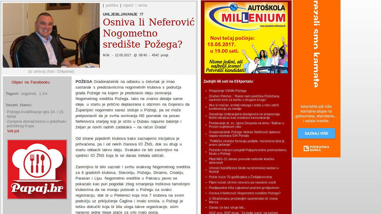 U članku objavljenom na 034Portal.hr Mirković je u svom članku iznio tezu da gradonačelnik Neferović osniva Nogometno središte Požegu izričito samo da bi "uhljebio" svog oca Neferovića starijeg.