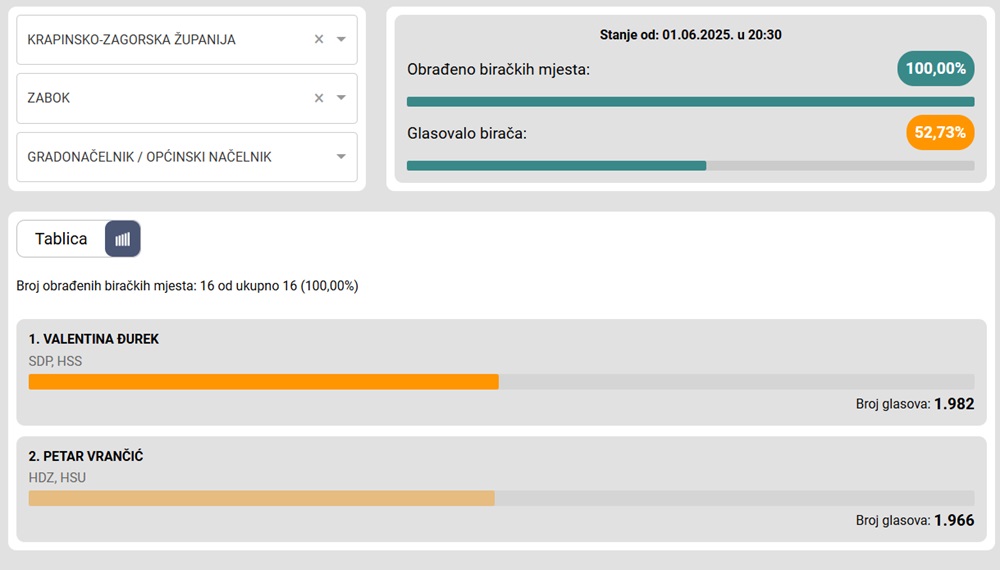 Tamo su u drugom krugu glasači birali između Valentine Đurek (SDP, HSS) i Petra Vrančića (HDZ, HSU).