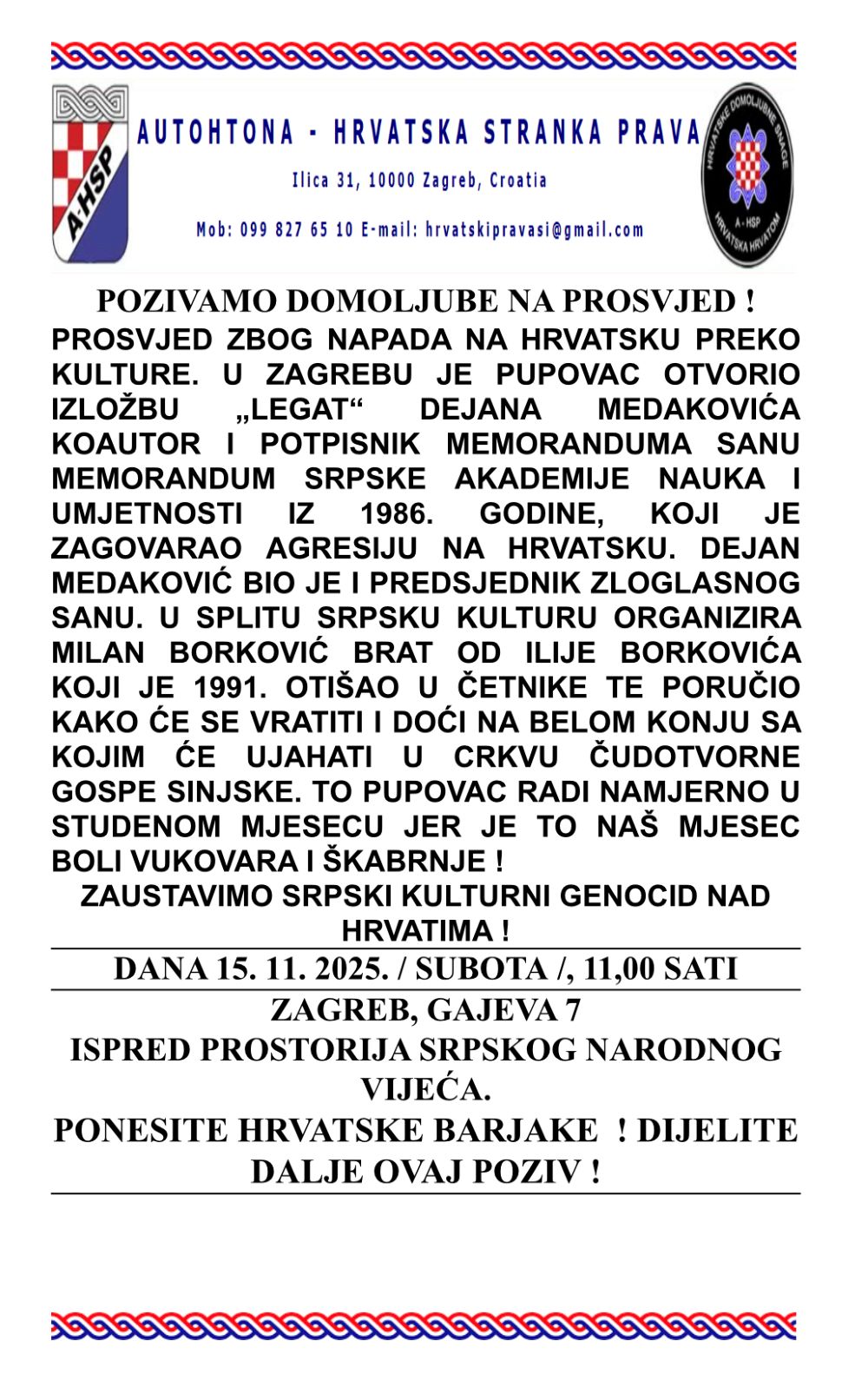 Naglasili su da "to Pupovac radi namjerno u studenom mjesecu jer je to naš mjesec boli Vukovara i Škabrnje!" "Zaustavimo srpski kulturni genocid nad Hrvatima!", stoji u pozivu kojeg su odaslali.