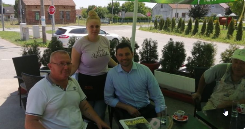 Za stolom nekog ugostiteljskog objekta Bernardić tako sjedi u neposrednoj blizini drugog muškarca, a neposredno iza njih, u sredini, stoji djelatnica tog kafića, naslonivši ruke na njihova ramena.