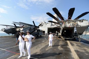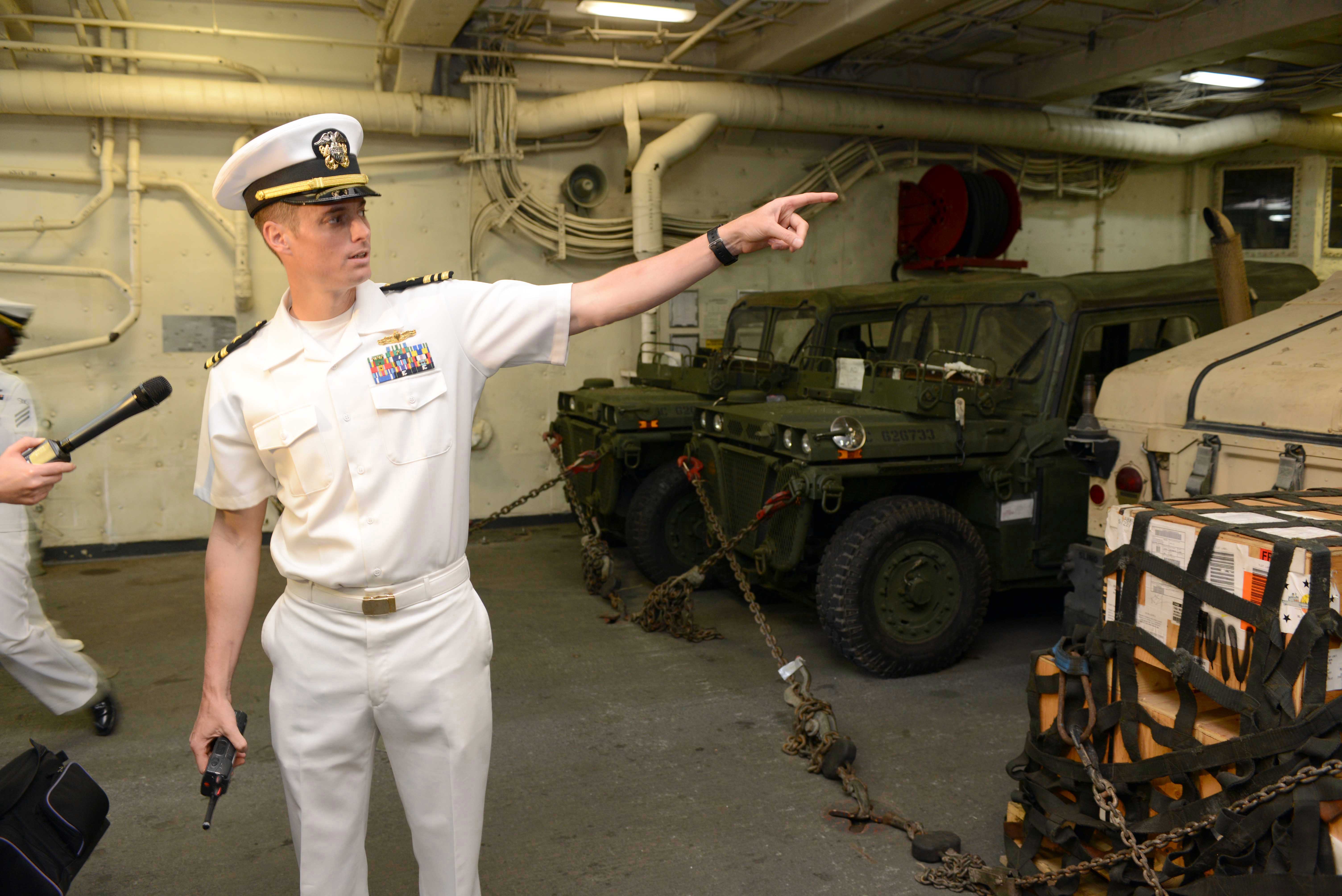 Novinari su za posjeta brodu imali priliku vidjeti oko 100 vojnih vozila, transportera, kamiona koji, kako je rečeno, služe za podršku marincima na kopnu. Na palubi su trenutačno tri transportna helikoptera. Četvrti je, rekao je Rule, prije mjesec dana imao nesreću, čiji se uzroci istražuju. Pao je u more ali nitko od članova posade i marinaca koji su se nalazili u njemu nije ozlijeđen, rekao je.