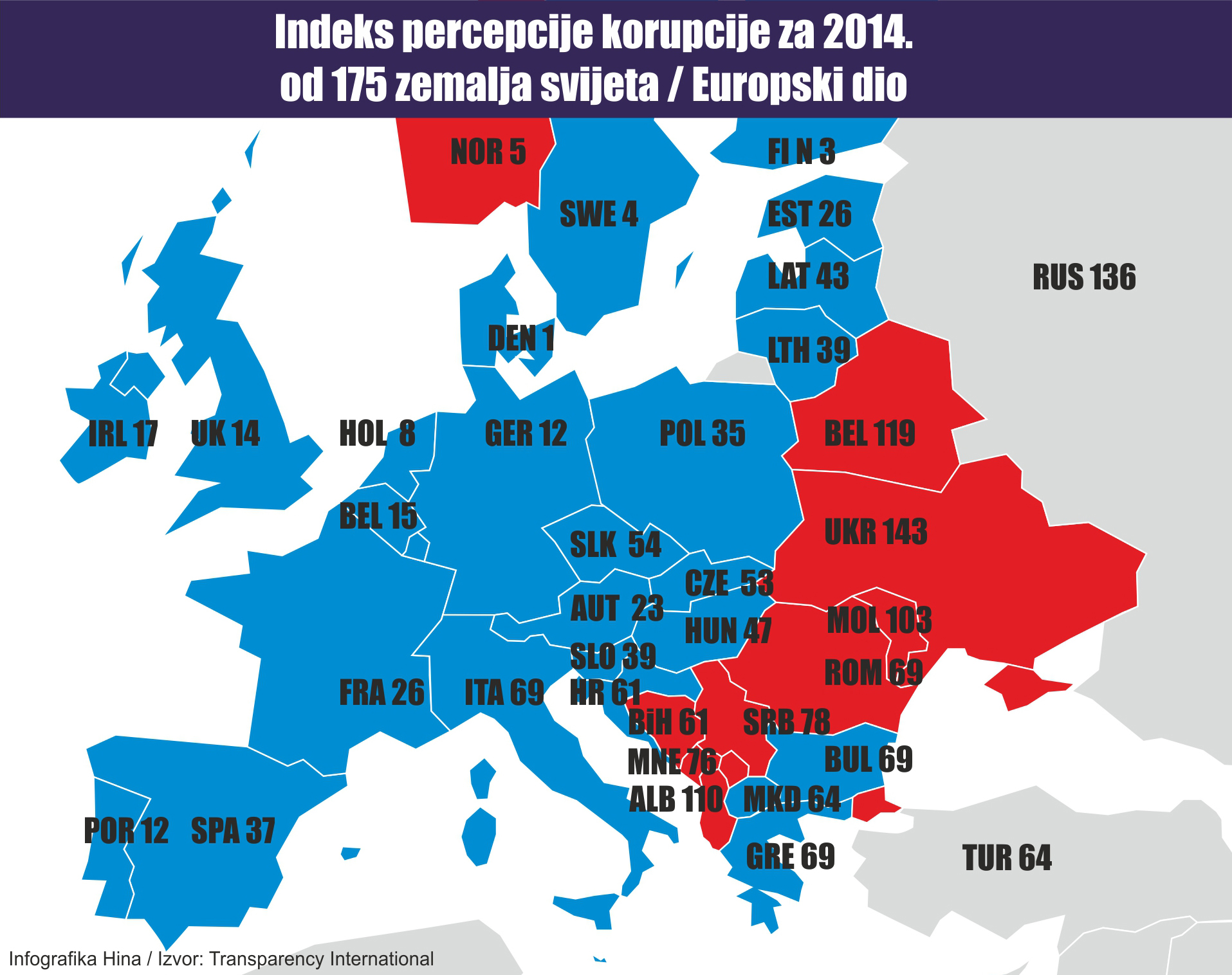 Najmanje korumpirana zemlja svijeta je Danska (92 boda), a slijede je Novi Zeland, Finska, Švedska, Norveška i Švicarska. Njemačka je dvanaesta, a Sjedinjene Države sedamnaeste. Kina je na stotom, a Rusija na 136. mjestu. Na samom dnu su Somalija, Sjeverna Koreja, Sudan, Afganistan i Južni Sudan.
