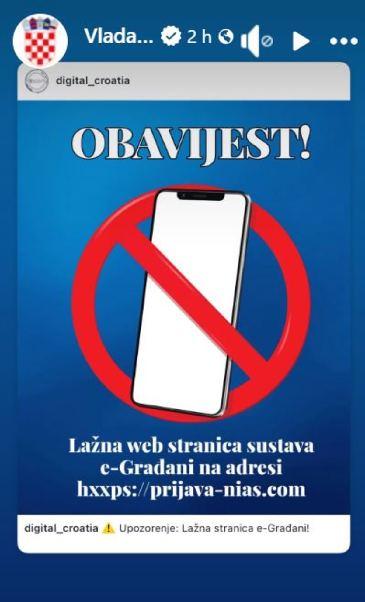 "Obavještavamo građane da se pojavila lažna web stranica sustava e-Građani na adresi hxxps://prijava-nias.com te upozoravamo da se ne unose korisnički pristupni podaci na takve stranice", navodi se.