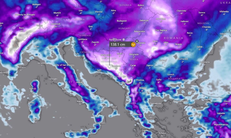 Najintenzivnije i najrasprostranjenije snježne padaline, u kombinaciji s mećavama, očekuju se diljem središnjeg Balkana, uključujući Bosnu, Hrvatsku, sjevernu Srbiju, južnu Sloveniju, južnu Mađarsku, sjever Rumunjske i veći dio Ukrajine. Lokalno će nakupljanje snijega premašiti 50 cm, moguće blizu 100 cm, nad zapadnom Bosnom i sjevernom Rumunjskom. Duboki snijeg predviđa se i za Zapadne Alpe.