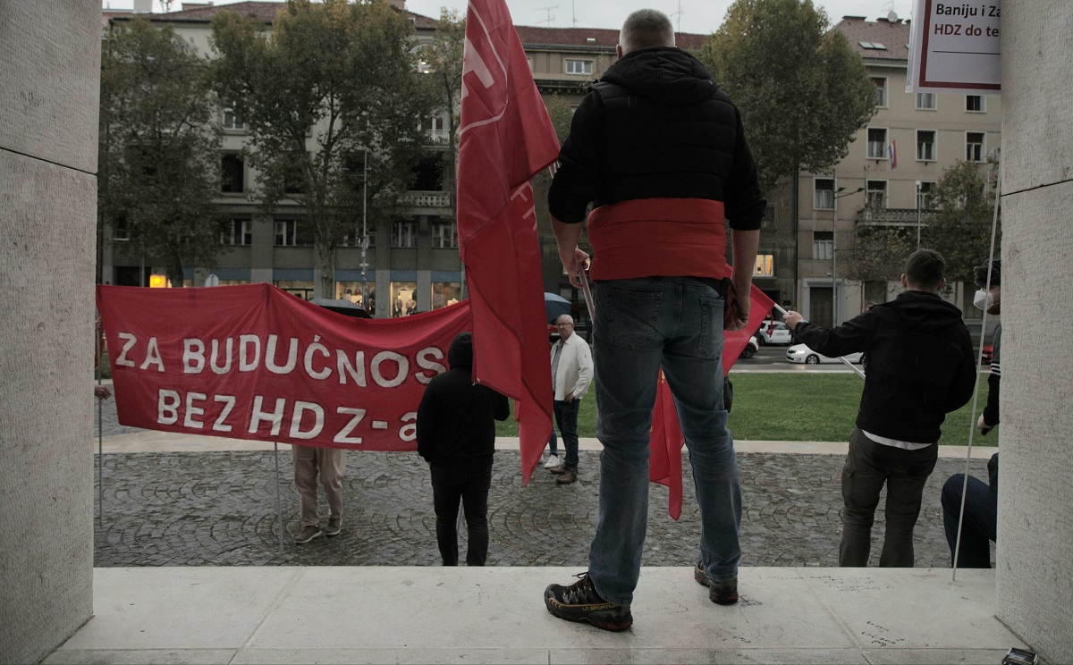 Na prosvjedu Radničke fronta protiv vladajuće Hrvatske demokratske zajednice (HDZ), koji je održan na prostoru Meštrovićevog paviljona, prekoputa Središnjice HDZ-a, sudjelovalo je, prema procjeni policije, bilo 50-tak sudionika.