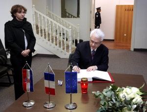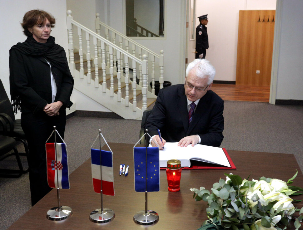 U barbarskom napadu na urede francuskog satiričnog lista Charlie Hebdo u srijedu je u Parizu ubijeno 12 osoba, a policija je u intenzivnoj potjeri za glavnim osumnjičenicima. Kad su u pitanju ove vrijednosti, njih bismo trebali braniti i u tome imate našu čvrstu potporu", napisao je hrvatski predsjednik u knjizi žalosti.