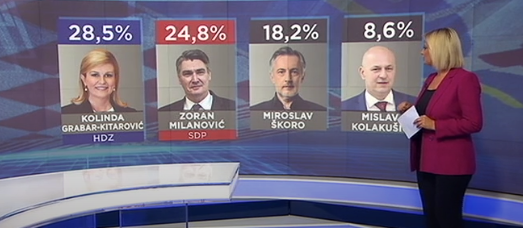 Da se ovoga vikenda održava prvi krug predsjedničkih izbora, Kolinda Grabar-Kitarović osvojila bi 28,5% glasova, Zoran Milanović 24,8%, a na trećem mjestu je Miroslav Škoro s 18,2%. Stoji to u podacima HRejtinga u okviru kojega HRT ekskluzivno predstavlja rezultate koje bi u prvom krugu predsjedničkih izbora mogli ostvariti potencijalni predsjednički kandidati.