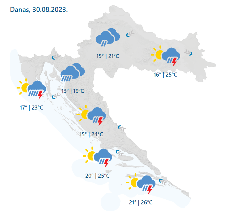 Hrvatsku u srijedu očekuje promjenljivo, ponegdje u zapadnim krajevima i pretežno oblačno vrijeme povremeno s kišom, lokalno i pljuskovima s grmljavinom, izraženijim uglavnom na Jadranu, prognozira Državni hidrometeorološki zavod (DHMZ).