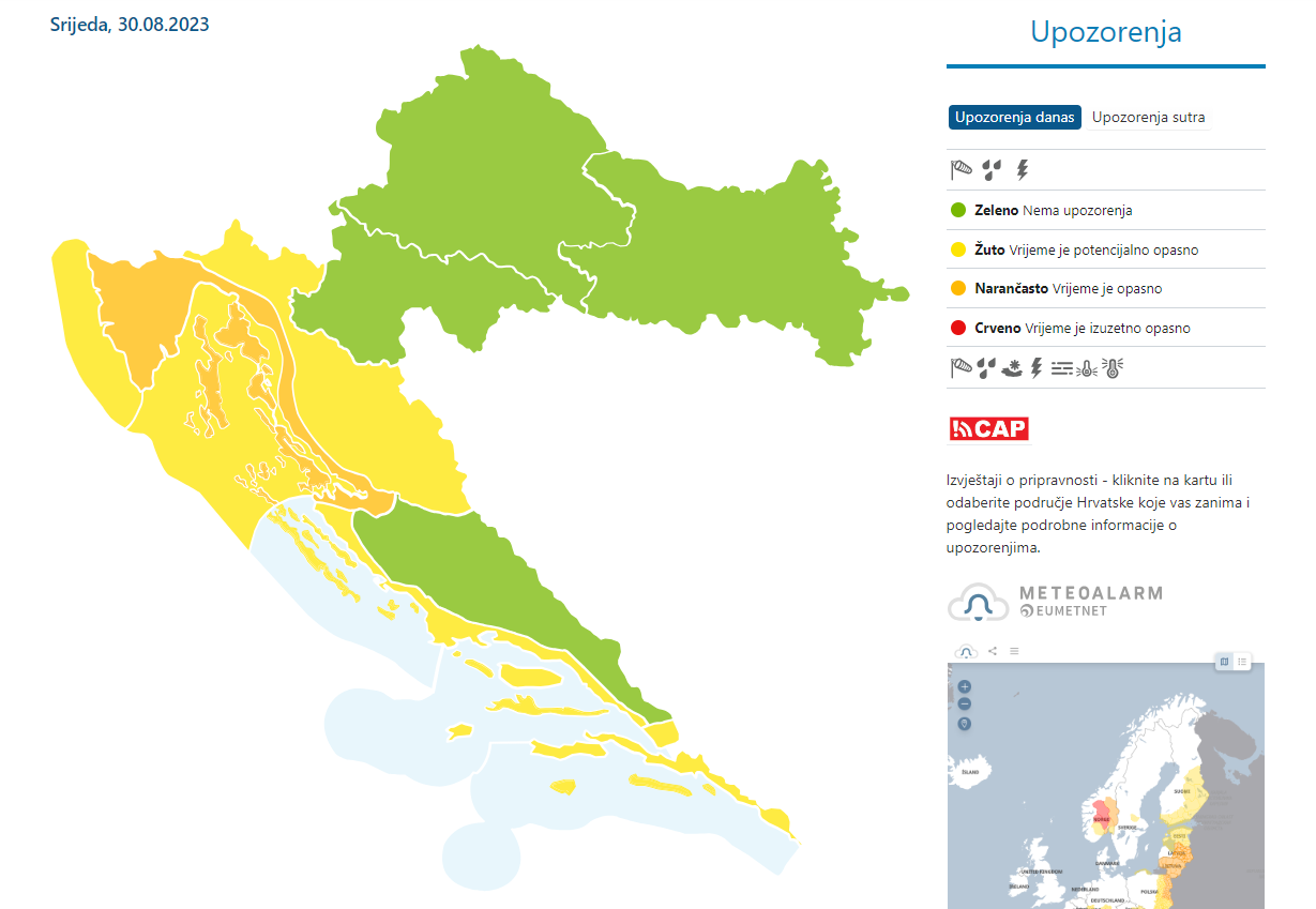 Gorski kotar, Lika i Dalmacija pod žutim su meteoalarmom, a Istra i Kvarner i obala duž sjevernog Jadrana pod narančastim.