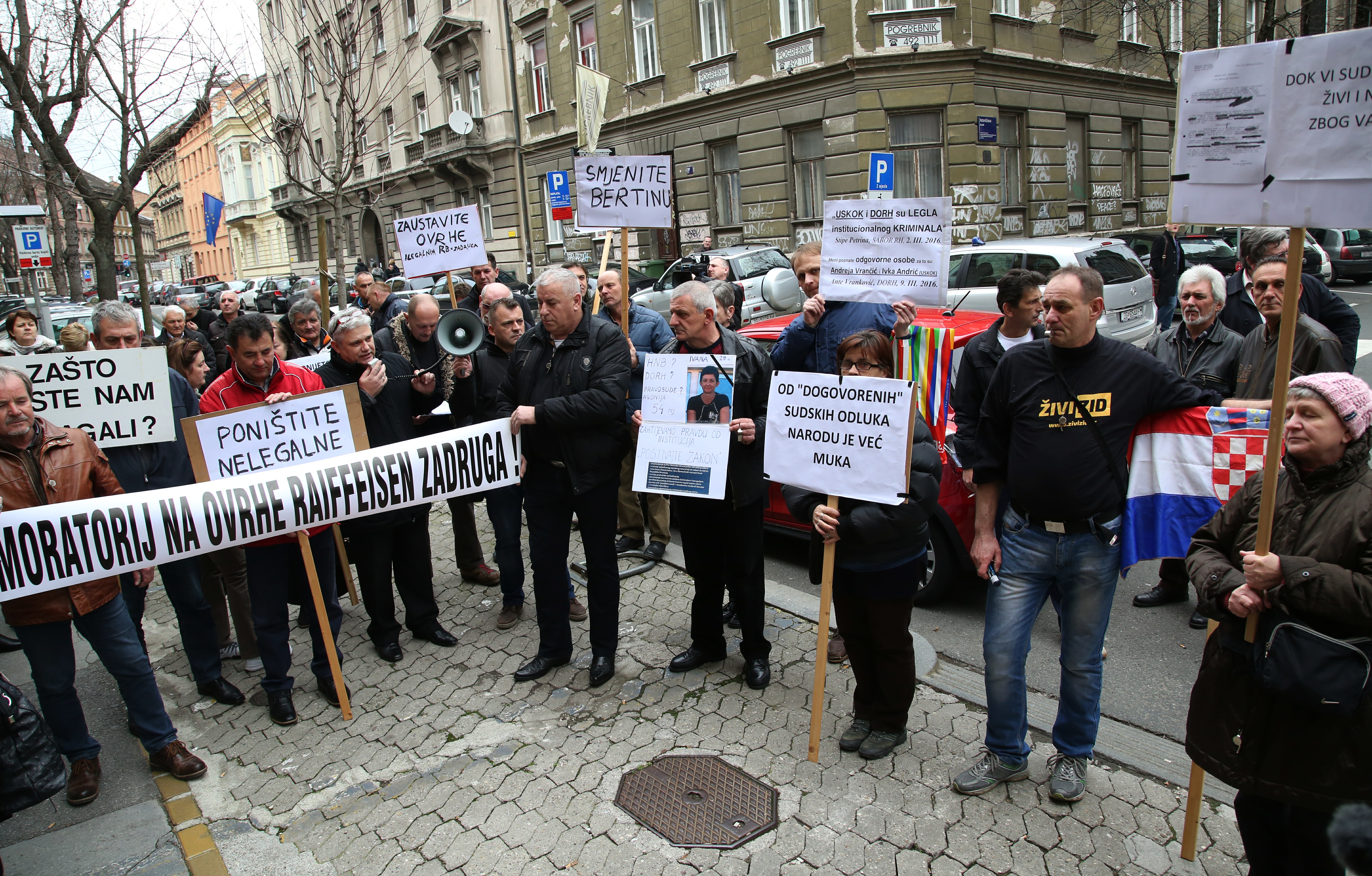 Na transparentima se moglo pročitati "Moratorij na ovrhe Reiffeisen zadruga", "Poništite nelegalne ugovore", "Rješenje donijeto u nedjelju nije omaška nego produžena ruka mafijaška","Od dogovorenih sudskih odluka narodu je muka", "USKOK i DORH - legla institucionalno organiziranog kriminala"...