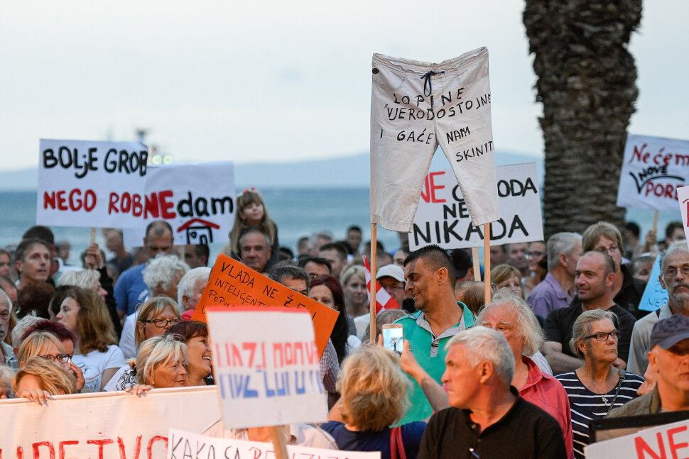 Nekoliko stotina Splićana okupilo se u nedjelju navečer na Rivi, na prosvjedu protiv poreza na nekretnine naslovljenom - "Sad je vrijeme da im narod kaže DOSTA", kojeg je organizirala inicijativa građana, tražeći ukidanje zakona, kojim je bilo predviđeno uvođenje porez na nekretnine.
