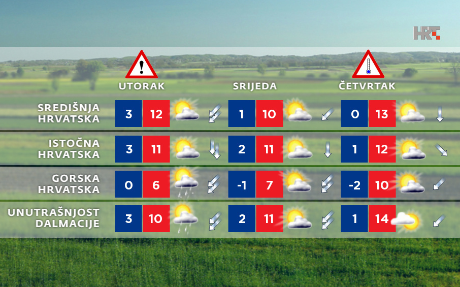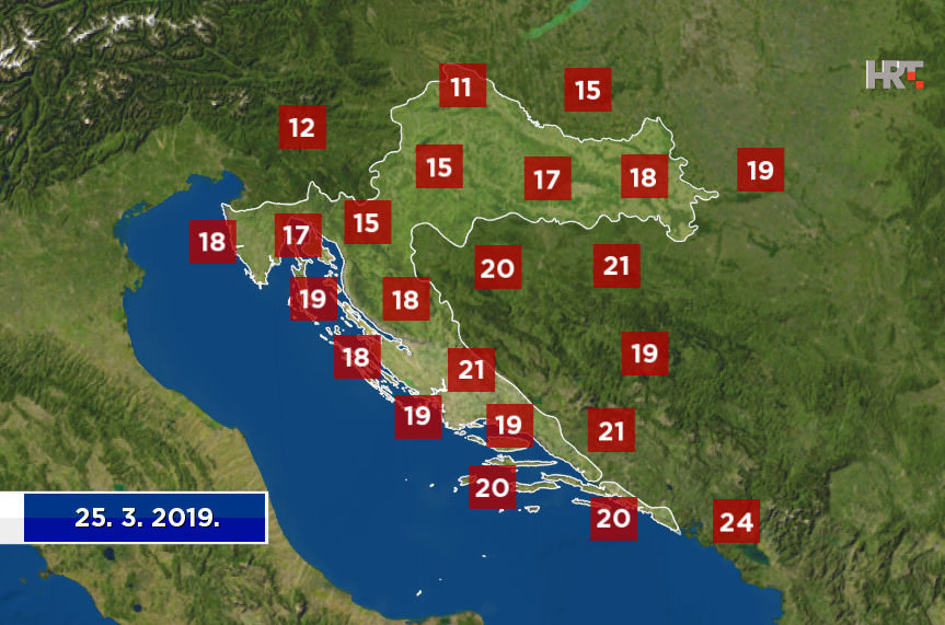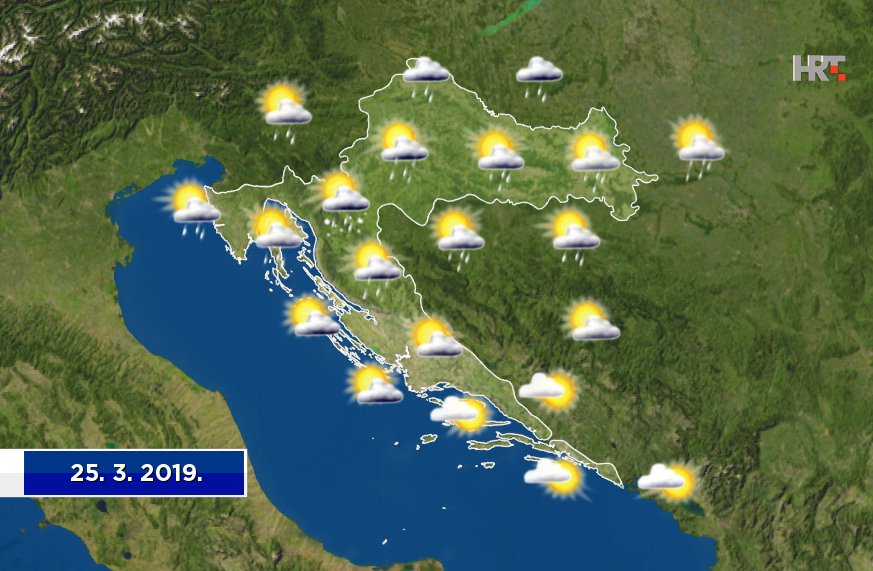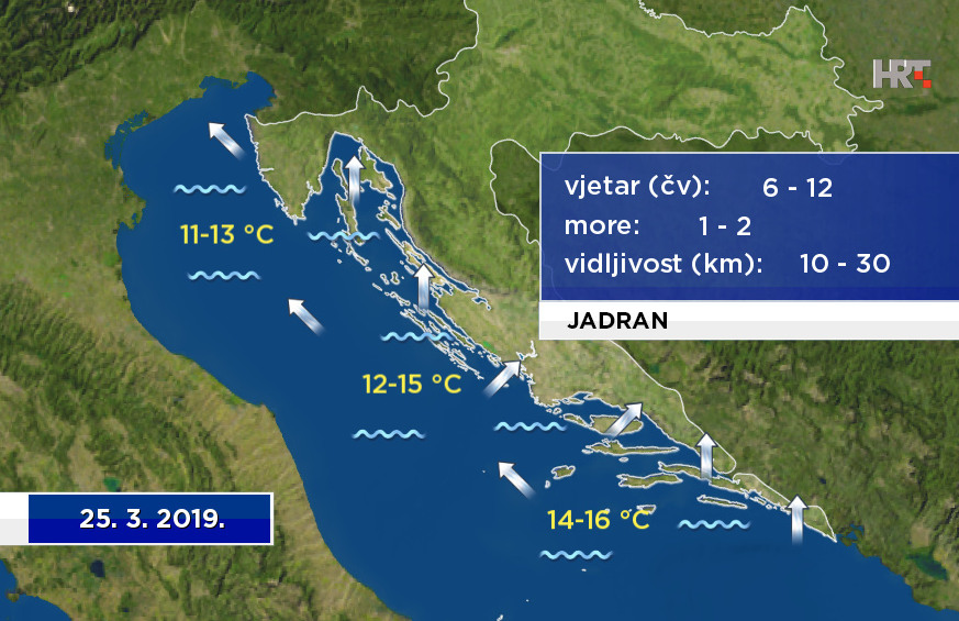 Nakon uglavnom suhog prijepodneva, uz i dulja sunčana razdoblja, poslijepodne će naoblačenje s kišom stići i u gorske predjele te na dio sjevernog Jadrana. Uz pad temperature navečer i u noći u višem će gorju padati snijeg i susnježica, a kiša i grmljavina na sjevernom Jadranu bit će sve češći. Upozoriti treba i na vjetar, koji će veći dio dana biti slab, a navečer će naglo zapuhati jaka i olujna, podno Velebita na udare i orkanska bura.
