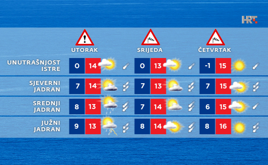 Već tijekom utorka, uz često jak sjeveroistočnjak u unutrašnjosti, te na Jadranu jaku i olujnu buru slijedi razvedravanje pa će u nastavku tjedna prevladavati suho, pa i barem djelomice sunčano, ali na Jadranu sve do petka i dalje prilično vjetrovito. U većini unutrašnjosti vjetar će već sredinom tjedna oslabjeti pa će ponovno biti jutarnjeg mraza, ali će dnevna temperatura zraka prema kraju tjedna ponovno biti u porastu, piše HRT.