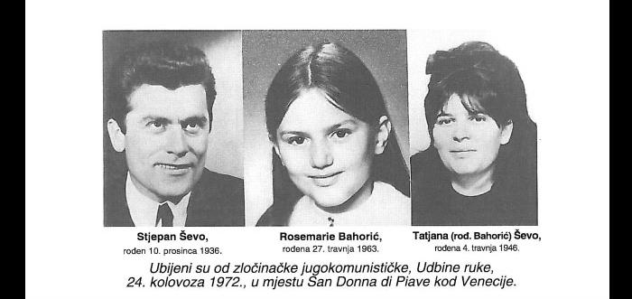 Prije 44 godine, 24. 8. 1972. jugoslavenska UDBA je zvjerski likvidirala Stjepana Ševu, njegovu ženu Tatjanu i devetogodišnju kćer Rosemarie. Izvršitelj ubojstava i nalogodavci još nisu privedeni pravdi. U svijetlu nedavnih presuda, ovaj slučaj još dodatno ukazuje na činjenicu da je Jugoslavija bila zločinačka i teroristička država. To svi znamo. Međutim, strašno bi bilo kad bi današnji nasljednici KP Hrvatske, sinovi nalogodavaca, među kojima su možda i visokopozicionarni političari u RH, razne udruge za ljudska prava i tzv. antifašisti štitili nalogodavce ovog zločina.