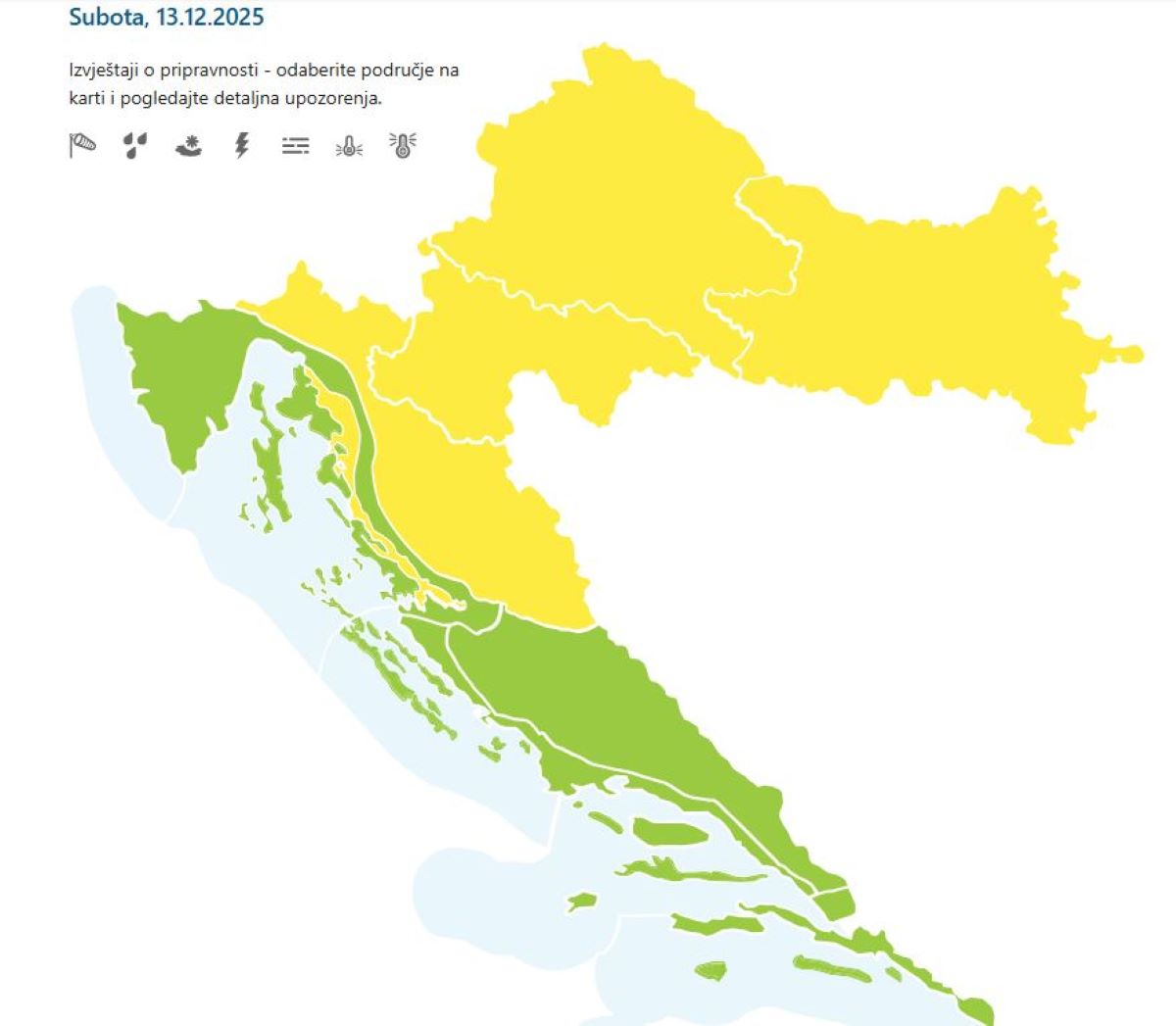 Za gotovo cijelu Hrvatsku, izuzev obalnog područja, uključen je žuti Meteoalarm zbog magle. "Budite na oprezu zbog rasprostranjene, lokalno guste magle. Moguć je izraženiji utjecaj na svakodnevne vanjske aktivnosti. Moguć je prekid rada zračnih luka te kašnjenja kao i otežano prometovanje uslijed izrazito smanjenje vidljivosti zbog čega putovanja mogu potrajati dulje od uobičajenog", stoji u upozorenju koje se odnosi na kontinentalni dio, dok je za Velebitski kanal upozorenje na snazi zbog jake bure.
