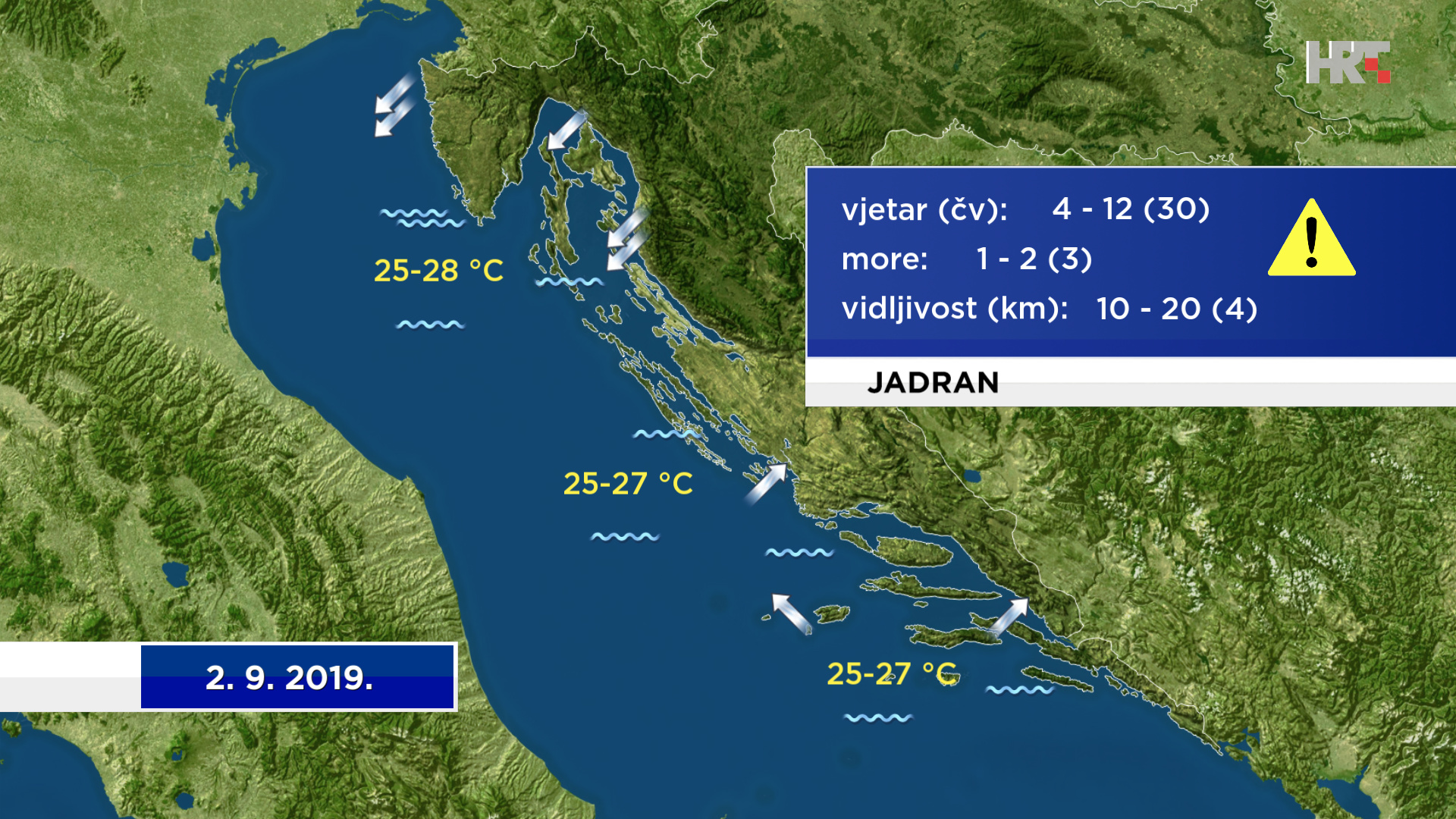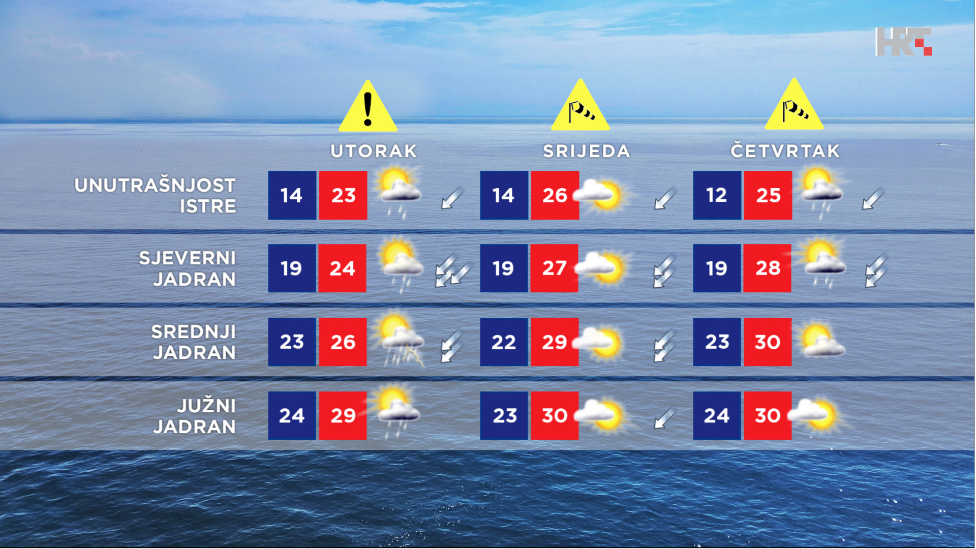 Na srednjem Jadranu djelomice sunčano s promjenljivom naoblakom, a poslijepodne uglavnom u unutrašnjosti Dalmacije i uz poneki pljusak praćen grmljavinom, no bit će vjerojatniji pa i izraženiji u noći na utorak kada će zapuhati jaka, u sjevernoj Dalmaciji i olujna bura. No, veći će dio dana, kao i na krajnjem jugu Hrvatske, vjetar biti slab, uglavnom jugozapadni i jugo pa će i more do večeri biti mirno ili malo valovito. Bit će i dalje vruće, uz najvišu dnevnu temperaturu od 30 do 34 °C."