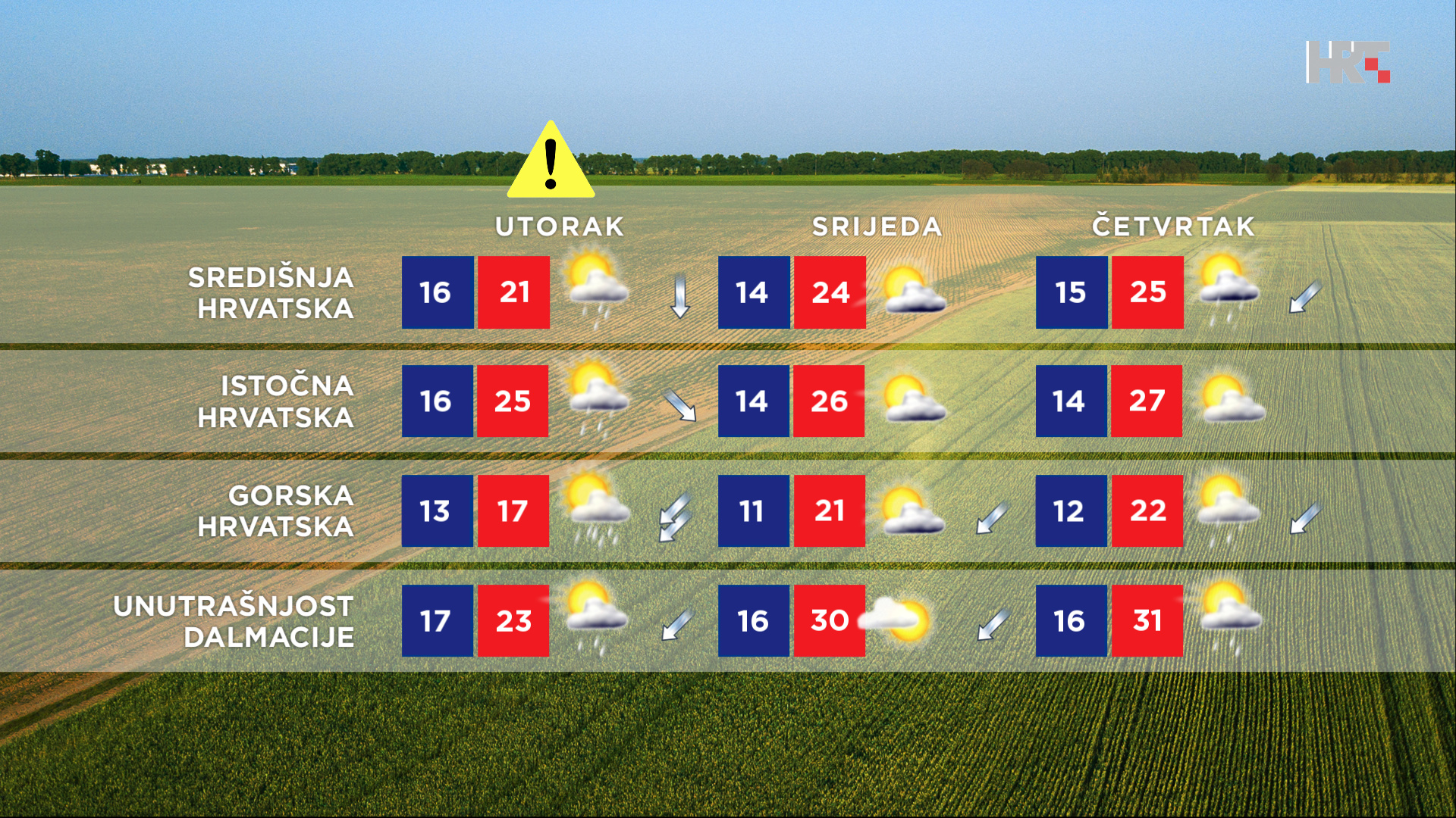 U središnjoj Hrvatskoj će već prijepodne biti slabog i umjerenog sjevernog i sjeveroistočnog vjetra, a prema večeri i jakog pa će se u sjeverozapadnim krajevima temperatura sniziti i za oko 6 °C u usporedbi s nedjeljnom, a vjerojatnost za pljuskove pa i nevremena bit će znatno veća prema kraju dana.