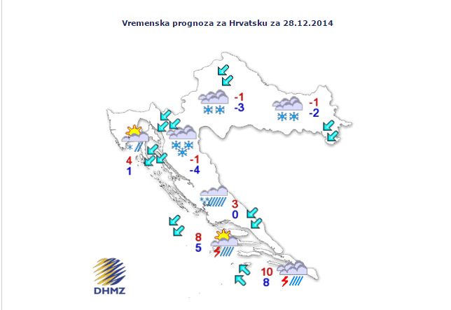 Prema podacima Državnog hidrometeorološkog zavoda, u ponedjeljak ujutro postupno će se razvedriti sa zapada, zatim djelomice ili pretežno sunčano, a poslijepodne u sjeverozapadnim i zapadnim krajevima prolazno naoblačenje i samo ponegdje vrlo malo snijega.