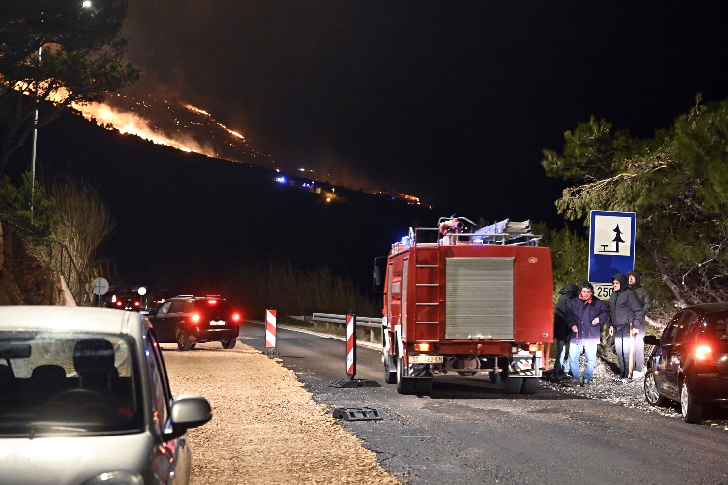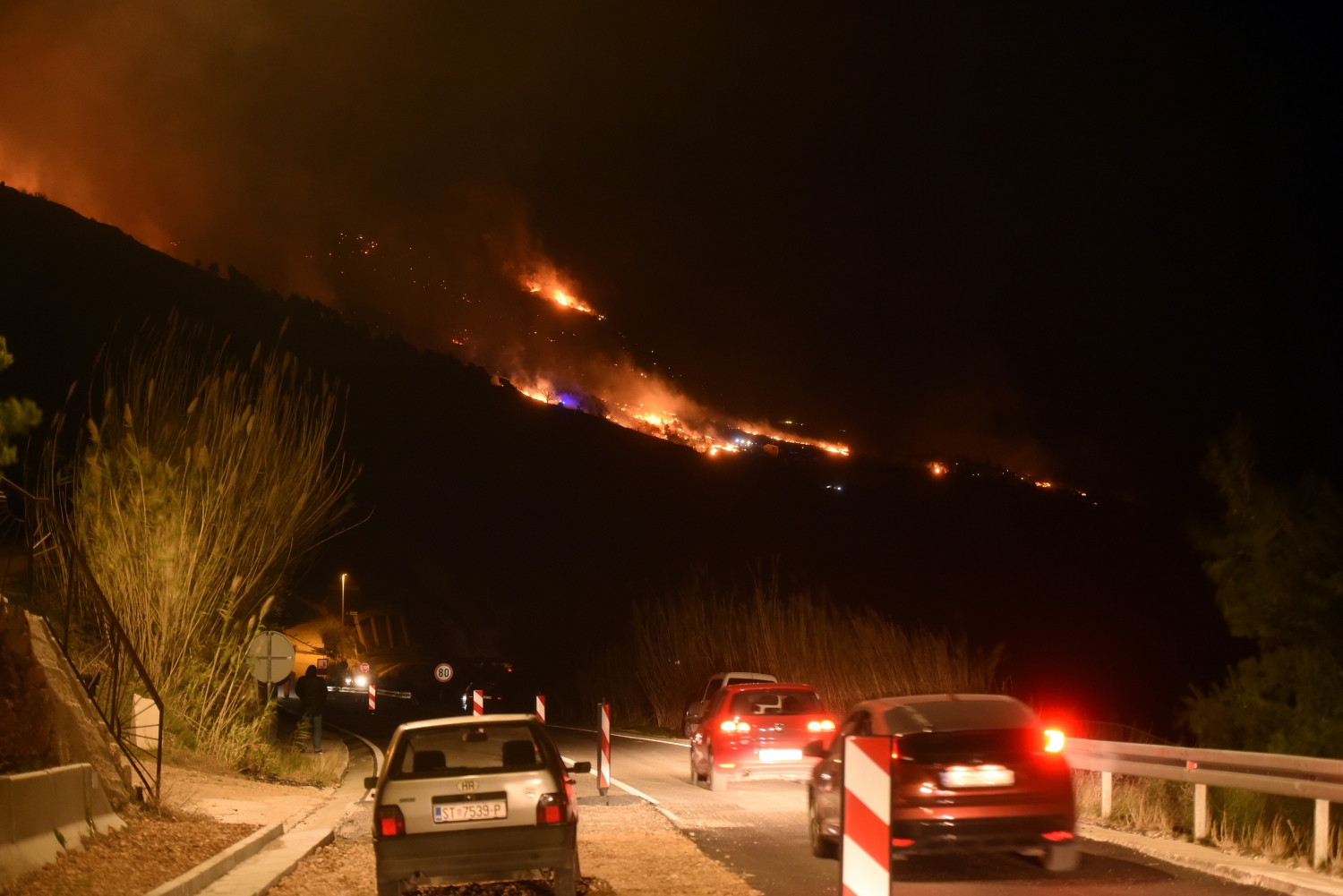 "Situacija na terenu je dosta teška budući da jak orkanski vjetar otežava gašenje požara2, kazao je glavni vatrogasni zapovjednik Slavko Tucaković te dodao kako nema ugroženih objekata. "U gašenju sudjeluje 108 vatrogasaca s 33 vatrogasna vozila s operativnih područja Omiš, Makarska, Split, Kaštela, Solin, Sinj, Imotski, Trogir i Intervencijske vatrogasne postrojbe Split-Divulje", objasnio je Tucaković i rekao kako se tijekom dana očekuje smirivanje situacije.