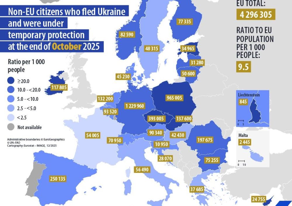 Najviši omjeri korisnika privremene zaštite na tisuću stanovnika zabilježeni su u Češkoj (36,0), Poljskoj (26,4) i Estoniji (25,5), dok je odgovarajuća razina na razini EU-a iznosila 9,5 na tisuću stanovnika. Na dan 31. listopada 2025., ukrajinski državljani činili su više od 98,4 posto korisnika privremene zaštite u EU-u.