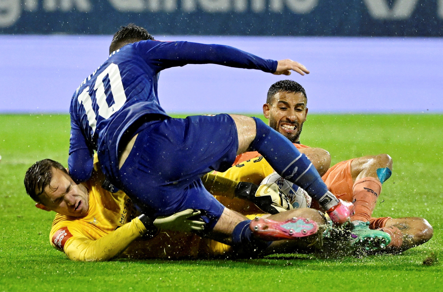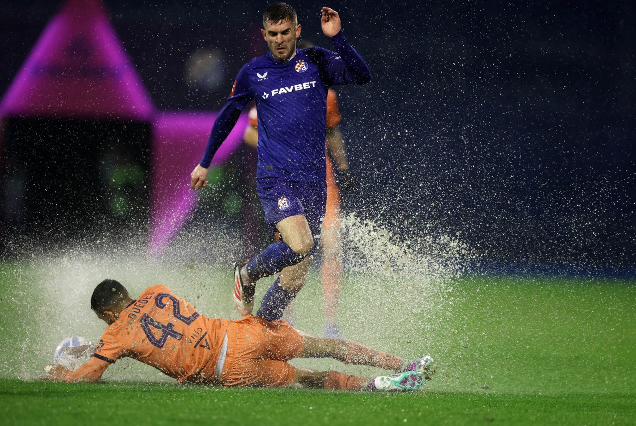 U nemogućim uvjetima igraju Dinamo i Osijek. Lopta zapinje u lokvama kiše koje su se stvorile na travnjaku, previše je to bilo vode za sustav drenaže.