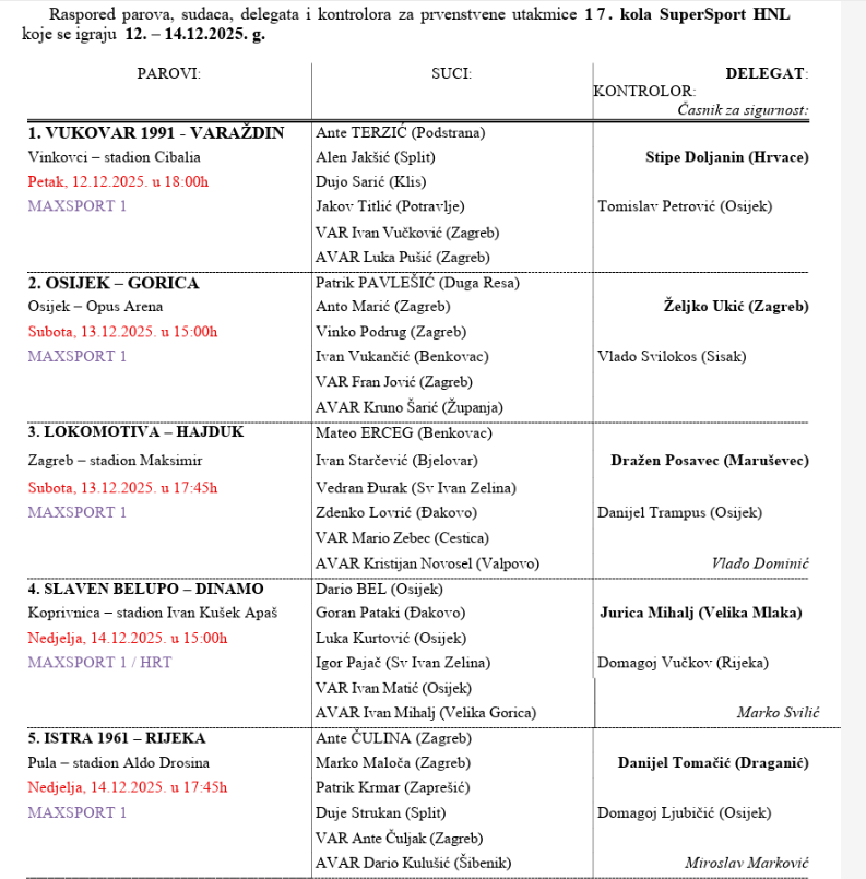U subotu od 15 sati Osijek će na Opus Areni ugostiti Goricu, a pravdu će dijeliti Patrik Pavlešić iz Duge Rese. Pomoćni suci su Anto Marić i Vinko Podrug, četvrti sudac je Ivan Vukančić, a VAR suci Fran Jović i Kruno Šarić.