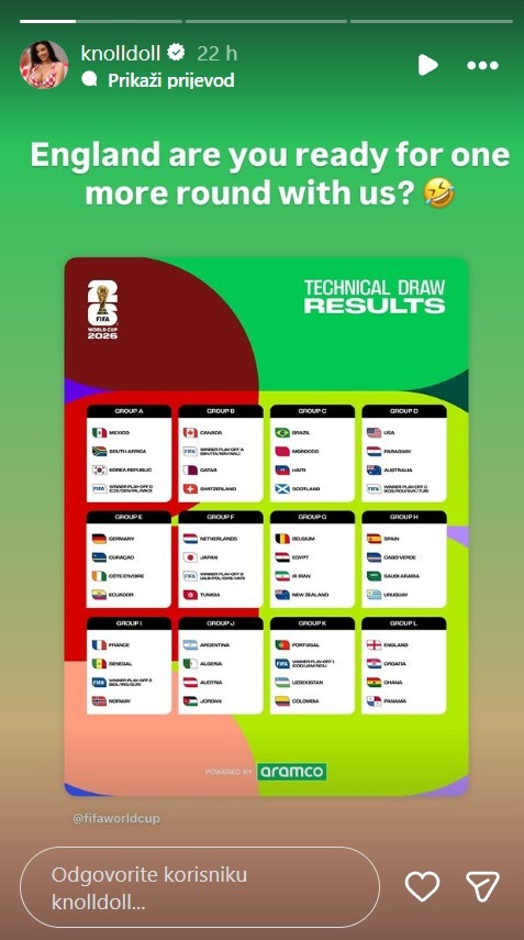 Ždrijeb je pratila i popularna navijačica Ivana Knoll koja je na svojim društvenim mrežama poslala posebnu poruku Englezima: "Jeste li spremni za još jednu rundu protiv nas?", napisala je Knoll uz emotikon koji se smije.