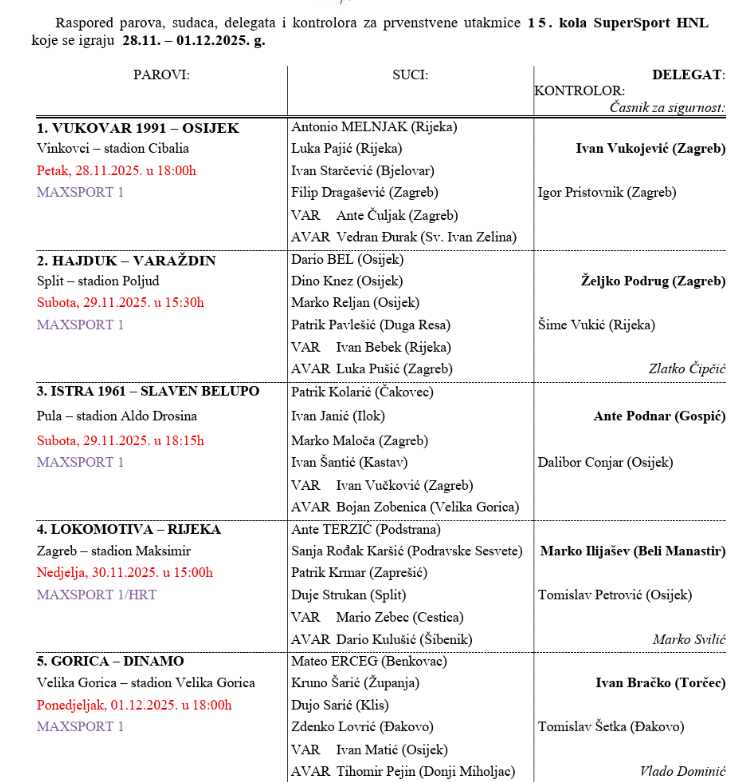 Hrvatski nogometni savez objavio je popis sudaca za susrete 15. kola HNL-a, koji će se igrati od petka do ponedjeljka.