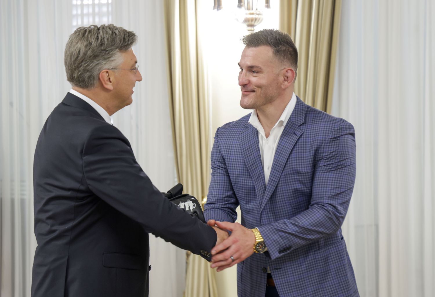 "U ime Vlade i mojih suradnika želim pozdraviti našeg proslavljenog sportaša, američkog Hrvata Stipu Miočića i njegovu obitelj. Drago mi je da su danas s nama. On je jedan od najvećih i uspješnijih teškaša u UFC-u. Pratili smo godine njegove karijere u Hrvatskoj. Želim mu čestitati na svemu što je učinio u sportskoj karijeri i izraziti veliko poštovanje jer je tijekom čitave svoje karijere nastavio posao vatrogasca. Zaista smo zadovoljno što smo u prilici čestitati na svemu i ponoviti velike uspjehe", rekao je premijer Andrej Plenković.
