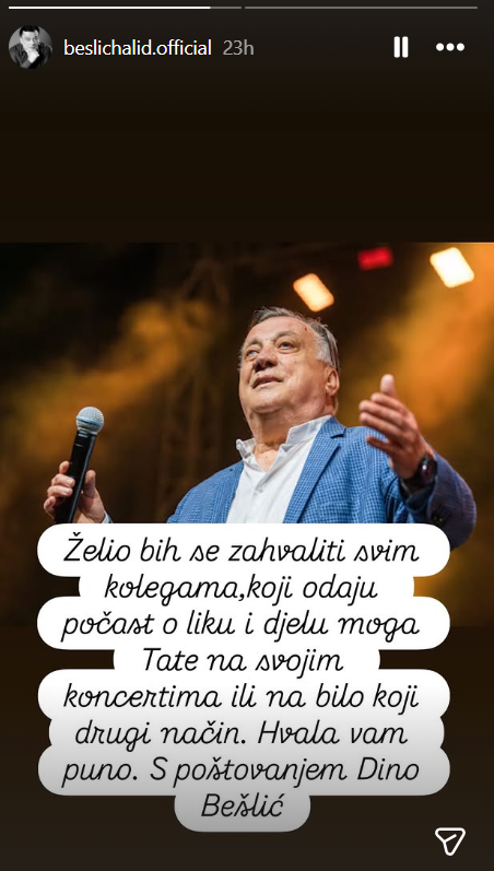 Dino Bešlić uputio je dirljivu poruku drugim pjevačima uz fotografiju svog pokojnog oca. "Želio bih se zahvaliti svim kolegama koji odaju počast liku i djelu moga tate na svojim koncertima ili na bilo koji drugi način. Hvala vam puno. S poštovanjem, Dino Bešlić", poručio je.
